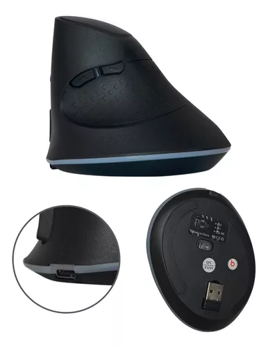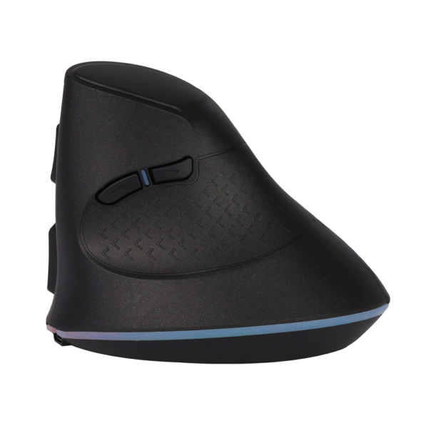 · Mouse vertical RGB recargable · Botones: 7D · Diseño elegante y futurista · 3 Conexiones: 2,4g + BT 5.1. + BT 5.1 · Luz gamer RGB · Bateria de 600 mAh · Duración de la batería: 15 días aprox.- DPI: 800-1200-1600-2400 · Puerto de carga: USB tipo C · Longitud del cable de carga: 50 cm